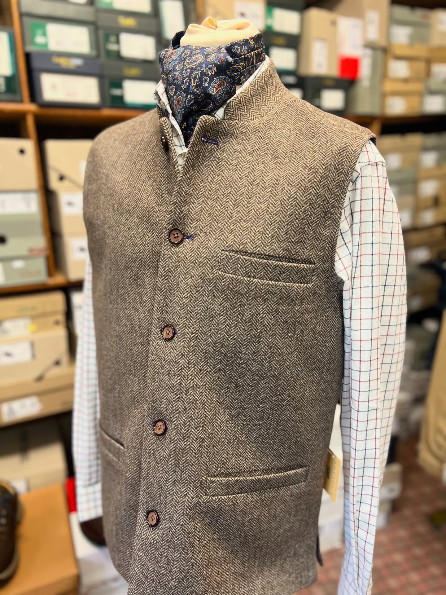 Blending traditional British tailoring with modern refinement, the Gurteen Penrith Tweed Gilet is a versatile layering piece designed for effortless country style. Crafted from 100% pure lambswool, spun in Yorkshire, in a rich herringbone weave, this elegant gilet offers warmth, structure, and sophistication. The stand collar and contrast buttonholes add a contemporary touch, while the floral satin lining brings a hidden flourish of personality. Perfect worn over a shirt or under a jacket, it transitions seamlessly from field to formal occasions.